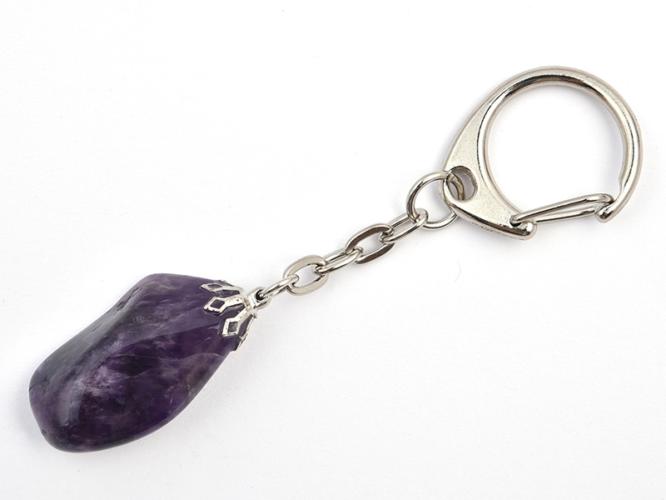 Szabálytalan formájú chevron ametisztből készült kulcstartó. A képen lévővel ellentétben már csak chevon ametisztől készült alapanyagot kapunk. Ez azt jelenti, hogy tartalmaz fehér részeket. Felülete jól csiszolt, de ennek ellenére előfordulhatnak csiszolási hibák. A felhasznált kő mérete 2-3 cm. A kulcstartó teljes hossza : 8-9 cm. A küldött termék alakja el fog tér