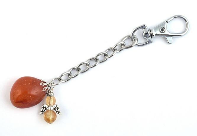 Szabálytalan formájú karneolból készült kulcstartó. A karneol tartalmazhat zárványos részeket. Felülete jól csiszolt, de ennek ellenére tartalmazhat csiszolási hibát. A karneol kő mérete 2-3 cm. A kulcstartó teljes hossza 8-9 cm. A küldött termék alakja, színárnyalata és mintázata el fog térni a képen látottól. Az angyalka 6 és 8 mm-es citrin ásvány gömbökből ké