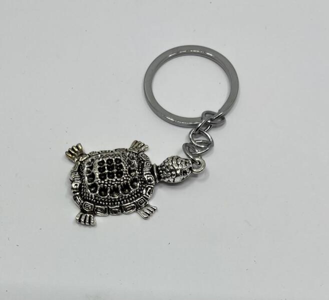 Ezüst színű, teknősbéka formájú kulcstartó. Ez a bájos teknős formájú kulcstartó tökéletes kiegészítő mindenkinek, aki szereti az állatokat vagy különösen a teknősöket. Részletgazdag kialakítása és kompakt mérete miatt praktikus és szemet gyönyörködtető választás. Kiváló minőségű anyagokból készült, hogy tartós és időtálló legyen. Ideális ajándék