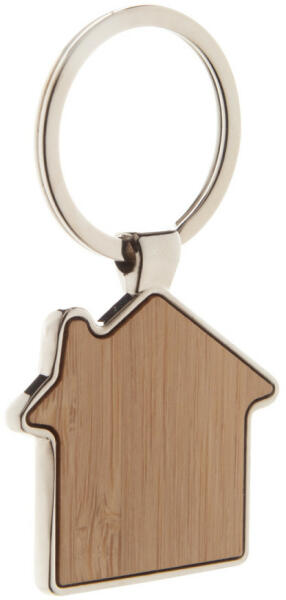 Ház formájú, fém kulcstartó bambusz betéttel. Kraft papír dobozban szállítjuk.
