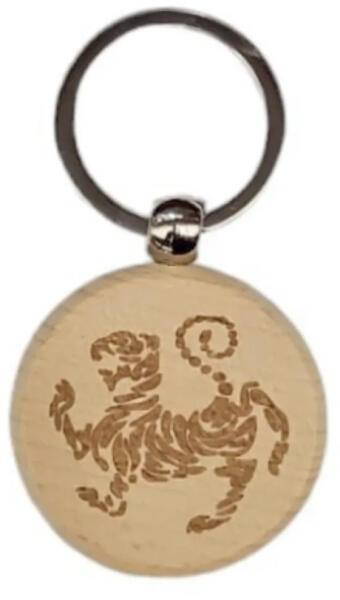 A fából készült kulcstartót egy Shotokan karate tigris díszíti, amit lézerrel vágtak a fába. Fém kulcskarikával. A fa kulcstartó átmérője kb. 4 cm vastagsága kb. 0.7 cm Kulcskarika átmérője kb. 3 cm