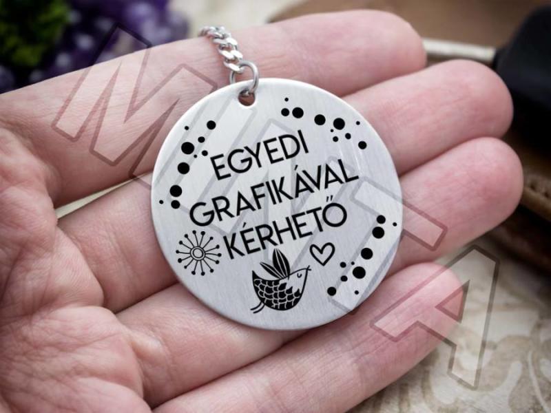Ezt a nagyszerű ajándék ötlet ünket egy gravírozott acél medál , és egy acél kulcstartó alk ot j a . Az kör alakú 42x42 mm méretű elegáns acél medál (egyik oldala fényes, másik oldala matt) díszíti, amit gravírozunk , így személyesebbé téve az ajándékot . A nemesacél más néven orvosi fém medál nem allergizál , ezért fémre érzékenyeknek is bátran ajánljuk .