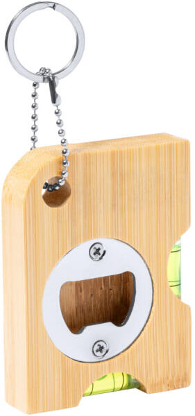 Többfunkciós bambusz kulcstartó fémgyűrűvel, üvegnyitóval és kettős vízmértékkel.