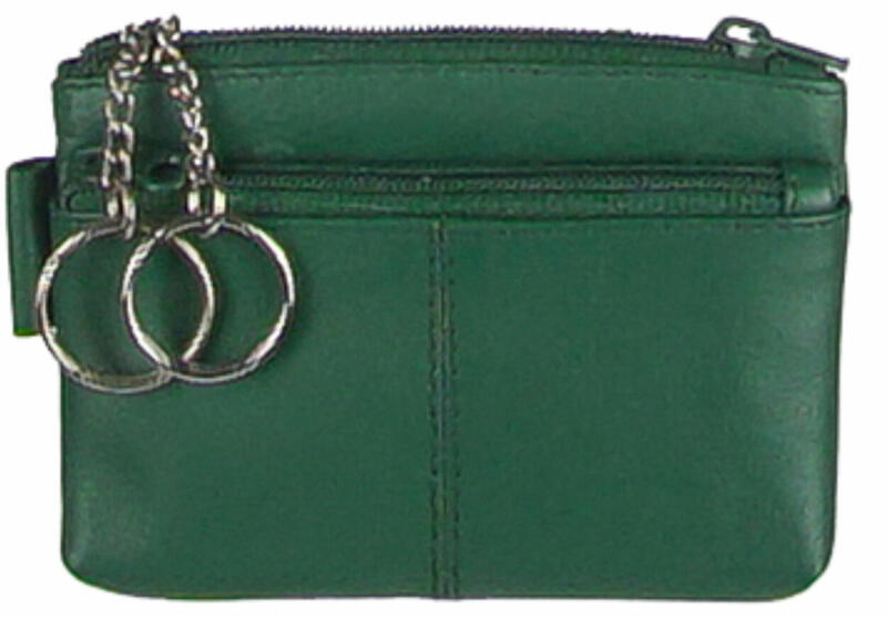 Puha zöld bőrből készült 2 részes kulcstartó. Kulcstartó része cipzárral zárható, amelyben két, fém lánccal rögzített kulcskarika található. Elején egy 5,5 cm magasan lévő cipzárral zárható, kulcstartó méretű lapos zseb helyezkedik el.