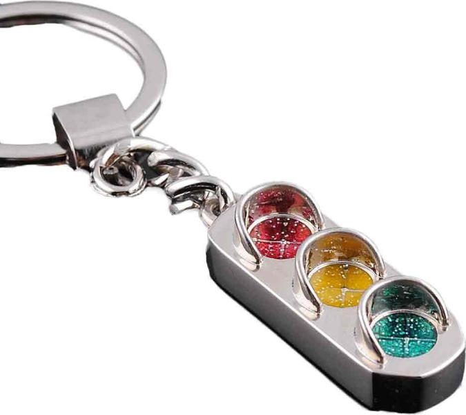 Fémből készült jelzőlámpa formájú kulcstartó.
