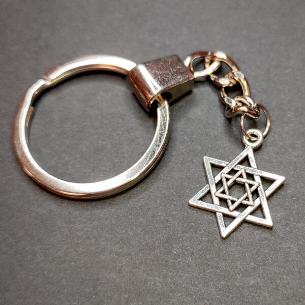 Dávid-csillag kulcstar tó. Paraméterek: Medál mérete: kb. 2,2 cm, anyaga fémötvözet. Kulcstartó karika típus eltérhet a képen láthatótól, készlet szerint küldjük. Ékszeralapok anyaga: rozsdamentes acél.