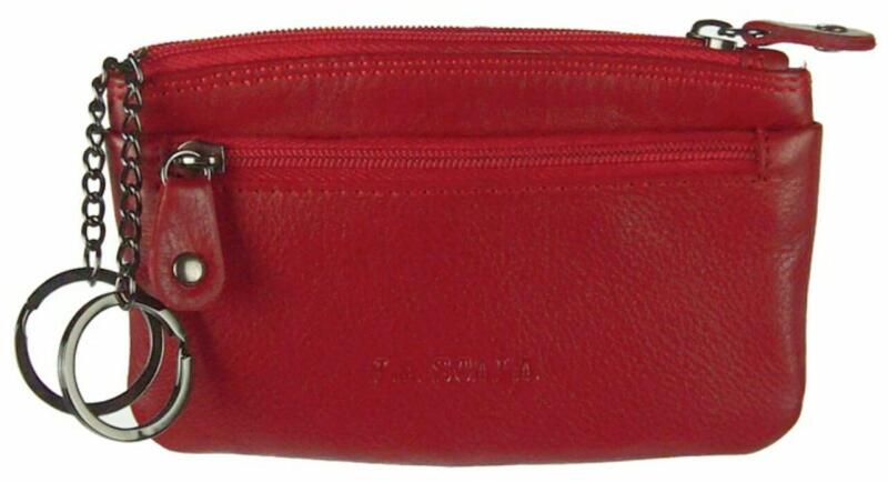 Puha piros bőrből készült 3 részes kulcstartó. Kulcstartó része cipzárral zárható, amelyben két, fém lánccal rögzített kulcskarika található. Elején két 5,5 cm magas lapos zseb helyezkedik el. Az első cipzárral zárható, a második felül nyitott.