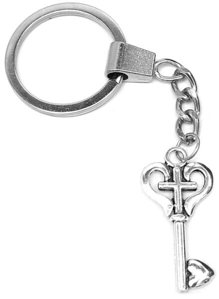 Kereszt a szívben kulcs kulcstartó. Paraméterek: Medál / mérete: kb. 4 cm. Medál anyaga cink ötvözet. Kulcstartó karika típus eltérhet a képen láthatótól, készlet szerint küldjük.