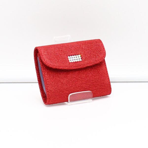 Valódi bőrből készült swarovski kővel díszített kártyatartó. Össze patentolható, ha kinyitjuk középen kártyatartó fólia található benne, amely varrással van rögzítve. Egyik oldalt a bőrben is van kettő darab kártyatartó. Kb. 24 darab kártya tárolására alkalmas.