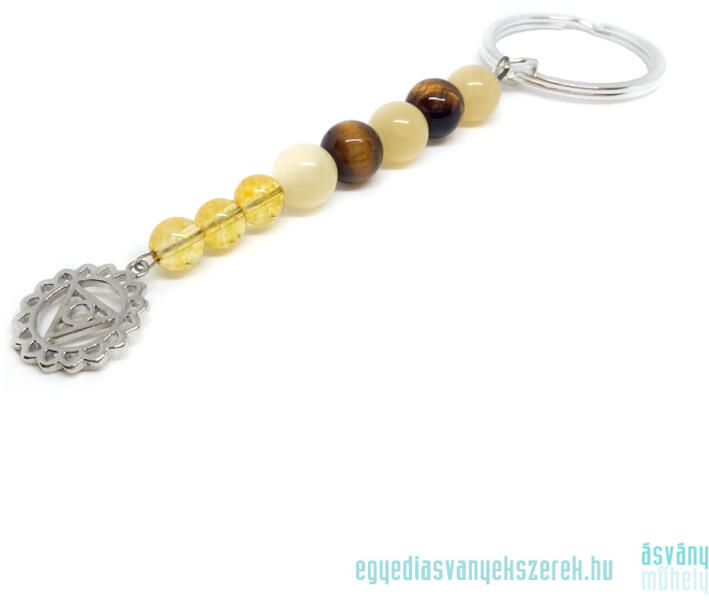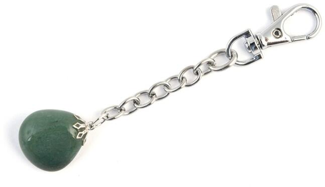 Szabálytalan, kavics formájú aventurinból készített kulcstartó. A kövek felülete a gondos csiszolás ellenére apróbb felületi hibákat tartalmazhat. Az aventurint a fém alkatrészhez kétkomponensű ragasztóval ragasztják hozzá. Az alkatrészek antiallergének. A kövek 2-3 cm nagyságúan, a kulcstartó 8-9 cm hosszú. A küldött kulcstartó színárnyalatban és formában kisebb