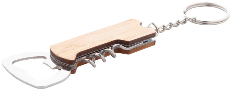Bambusz és rozsdamentes acél üvegnyitós kulcstartó dugóhúzóval és zsebkéssel.