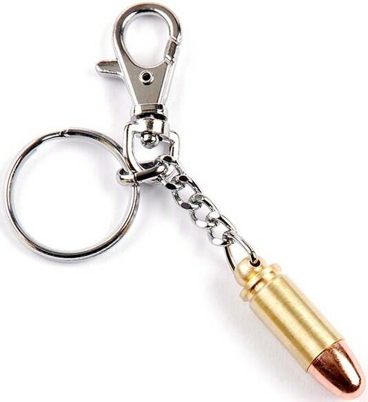 9mm-es töltény kulcstartó lánccal, karabinerrel és kulcskarikával Töltény alakú kulcstartó rövid lánccal, a lánc végén kétféle kulcs felfüggesztési lehetőséggel: kis karabinerrel és karikával. Ajándéknak is kiváló, de saját részre is menő kiegészítője lehet felszerelésünknek.