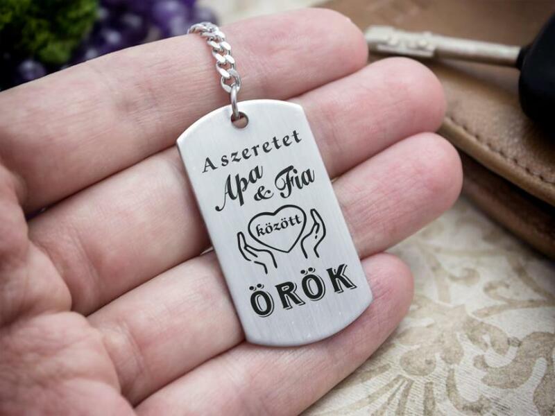 " Szeretet apa és fia közt " jeles acél szögletes medálos kulcstartó A számotokra állítottunk össze egy kedves meglepetést! Ezt a nagyszerű ajándék ötlet ünket egy gravírozott acél medál , és egy acél kulcstartó alk ot j a . A kulcstartót egy szögletes alakú 35×20 mm méretű elegáns acél medál díszíti, amit lézer gravírozunk . A nemesacél más néven orvosi fém