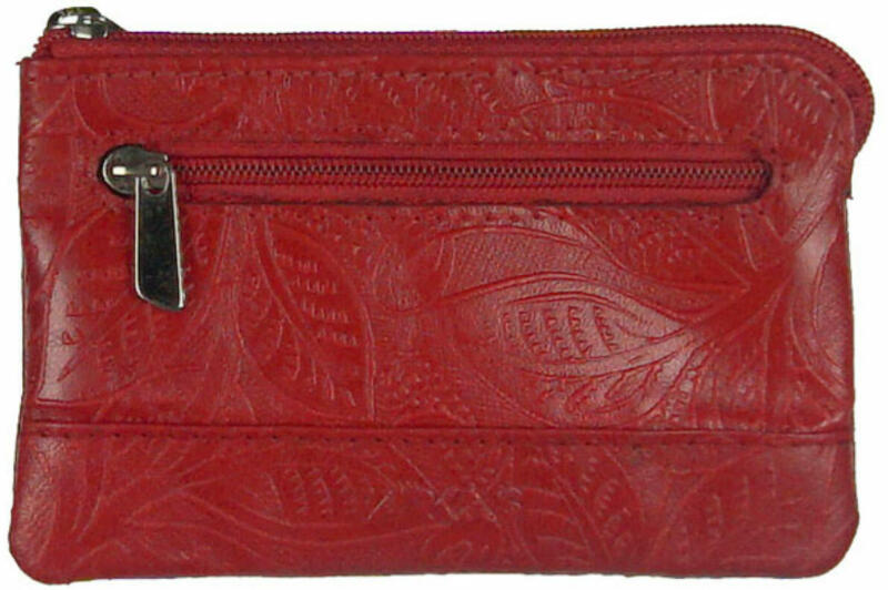 Levél mintásra nyomott piros bőrből készült 2 részes kulcstartó. Kulcstartó része cipzárral zárható, amelyben egy bőr pánttal rögzített kulcskarika található. Elején egy 5,5 cm magasan lévő cipzárral zárható, kulcstartó méretű lapos zseb helyezkedik el.