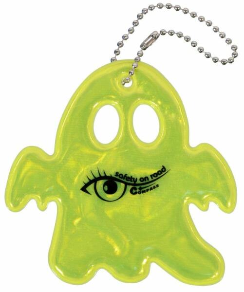 Fényvisszaverő medál lánccal, ruházatra, iskolatáskára, hátizsákra, zsebre vagy cipzárra rögzíthető. Jól látható kiegészítő, nagy távolságból, gyerekeknek is megfelelő. Különösen rossz látási viszonyok között vagy szürkületben többszörösére meghosszabbítja azt a távolságot, amelyre a vezető észreveszi a gyalogosokat. Termék részletek: motívum: szellem s