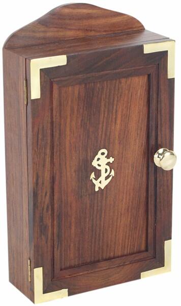 Fa kulcsos szekrény, horgony mintával MÉRETE: 16,5 × 7 × 29 magas cm ANYAGA: fa, réz CSOMAGOLÁS: kartondoboz Fedezze fel ezt a stílusos, fából készült kulcsos szekrényt, amely tökéletes megoldást kínál a kulcsok rendezett tárolására otthonában vagy irodájában. A dekoratív horgony díszítés és a sárgaréz zsanérok nem csupán eleganciát kölcsönöznek a tárolónak,