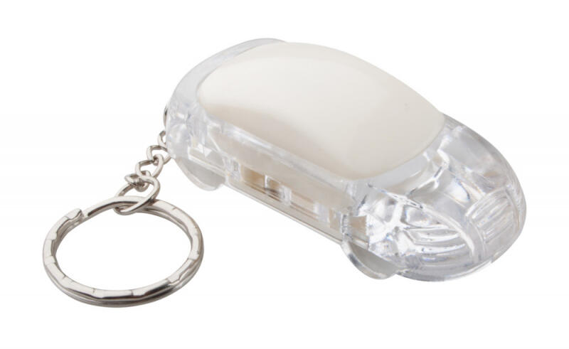 Autó formájú műanyag kulcstartó fehér LED fénnyel és fém kulcskarikával. Gombelemmel szállítjuk.