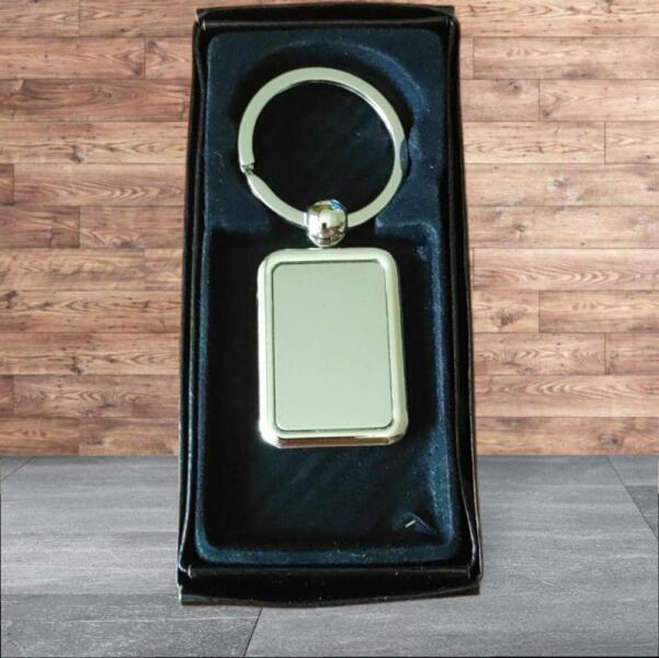Téglalap alakú kulcstartó. Kerekített sarkokkal. Mérete : 2,5 x 3,5 cm Az elején a gravírozható felület 5mm-el kisebb! Kis fekete tok tartozik hozzá.