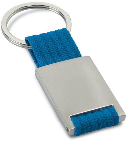 Téglalap alakú fém kulcstartó Téglalap alakú fém kulcstartó színes poliészter szövött pánttal.