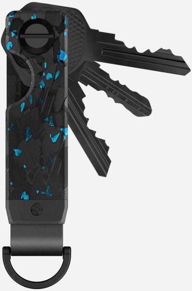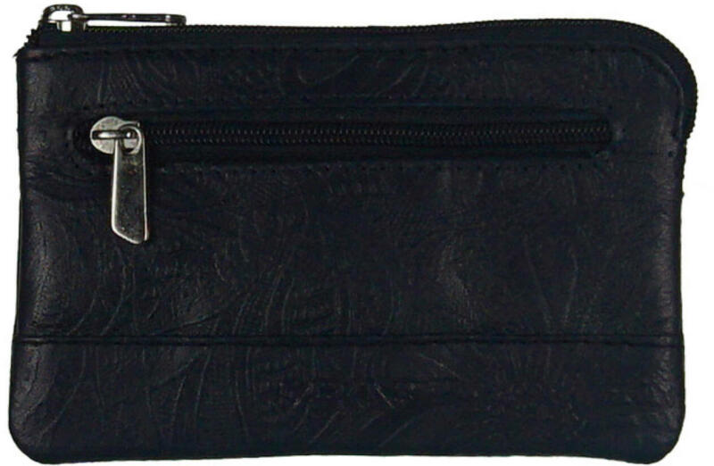 Levél mintásra nyomott sötétkék bőrből készült 2 részes kulcstartó. Kulcstartó része cipzárral zárható, amelyben egy bőr pánttal rögzített kulcskarika található. Elején egy 5,5 cm magasan lévő cipzárral zárható, kulcstartó méretű lapos zseb helyezkedik el.