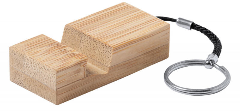 Mobiltelefon-tartó kulcstartó bambuszból, fém gyűrűvel.