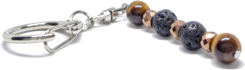 Kiváló minőségű valódi bazalt ásványból készült ásvány kulcstartó. A hólyagos bazalt egyedi, texturált felülete és sötét árnyalatai különleges megjelenést adnak, miközben az erő és az állhatatosság szimbólumaként viselhető. A kulcstartó valódi hólyagos bazalt, tigrisszem 8-9 mm ásványból és hematit dísszel készült. Az ásvány, kulcstartó formában viselv