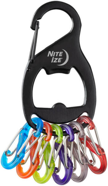Rozsdamentes acélból készült, sörnyitóként is funkcionáló karabiner hat db színes, műanyag, kulcstartó S-Biner karabinerrel. Csatold a kulcsokat egyesével az S-Binerekhez, majd az egész KeyRack-et csatold a nadrágod övbujtatójához vagy a táskád pántjához. Fekete színű változat.