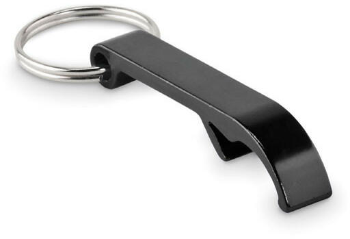 Újrahasz. alumínium kulcstartó Újrahasznosított alumíniumból készült fényes kulcstartó üvegnyitóval.