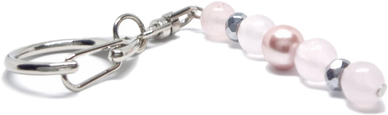 Kiváló minőségű valódi rózsakvarc ásványból készült ásvány kulcstartó. A rózsakvarc finom rózsaszín árnyalatával és letisztult formájával, elegáns kiegészítő, amely a gyengédség és a szeretet érzését tükrözi. A kulcstartó valódi rózsakvarc, shell pearl (rózsaszín) 8-9 mm ásványból és hematit dísszel készült. Az ásvány, kulcstartó formában viselve