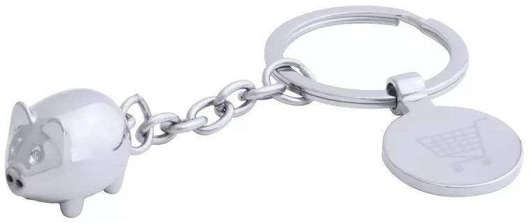 Termék jellemzői: Malac alakú kulcstartó, bevásárlókocsi érmével, hátán fényes króm borítással. Csak az érme hátulja gravírozható körvonalasan. Fekete kartondobozba csomagolva szállítjuk. Gravírozási technika : Körvonalas (mechanikus) Érme méret:23mm, vastagság 2mm Anyaga : Fém, fényes króm borítással Kulcshoz való csatlakozás:hagyományos kulcskarika.