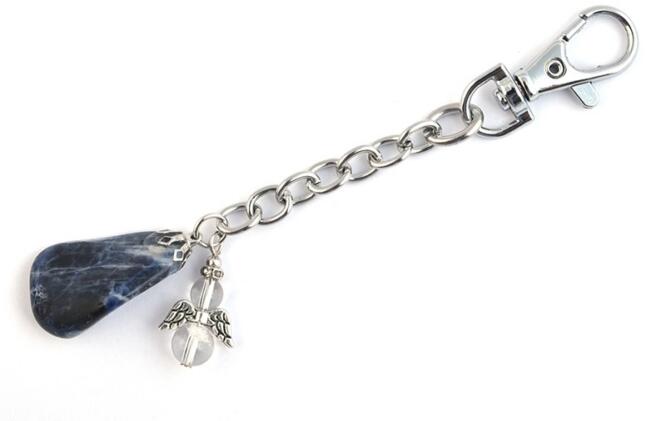 Szabálytalan formájú szodalitból készült kulcstartó. A szodalit mintázata és az erezet sűrűsége és vastagsága minden kulcstartónál eltér. Felülete jól csiszolt, de ennek ellenére tartalmazhat csiszolási hibát. A felhasznált szodalit mérete 2-3 cm. A kulcstartó teljes hossza : 8-9 cm. A küldött termék formája el fog térni a képen látottól. A hegyikristály angyalka