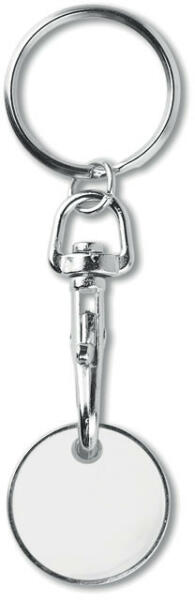 Érmés kulcstartó (EUR) Bevásárlókocsi érmés kulcstartó, EUR méret. Fémből készült, az elején zománcozott bevonattal. Az érme mérete Ø23,2 x 2,1 mm vastag.