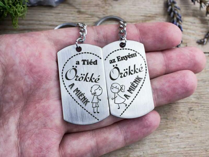 "A tiéd, az enyém - Örökké a miénk " feliratos acél téglalap medálos kulcstartók Számotokra állítottunk össze egy kedves meglepetést! Különleges páros ajándékot készítettünk nektek, mellyel kifejezhetitek az összetartozásotokat. A két fél szív eggyé illeszkedik össze, miképpen Ti alkottok tökéletes párt, a köztetek lévő szeretetet és összhangot jelképezi a k