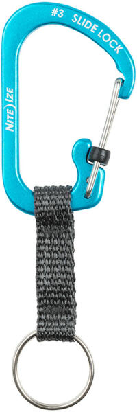 Zárható, alumínium karabiner rövid szövetpánton lévő kulcstartó karikával. A karabiner egy SlideLock tolózárral reteszelhető, így magabiztosan rögzíthető egy övhurokhoz, hátizsákhoz vagy táska pántjához. Kék színű változat.