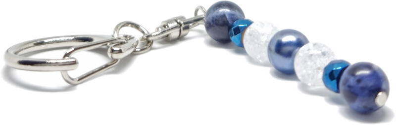 Kiváló minőségű valódi szodalit ásványból készült ásvány kulcstartó. A szodalit mélykék árnyalatával a nyugalmat és önbizalmat erősíti, miközben a tiszta kommunikáció és belső harmónia szimbólumaként viselik. A kulcstartó valódi szodalit, roppantott hegyikristály matt, shell pearl (kék) 8-9 mm ásványból és hematit dísszel készült. Az ásvány, kulcstartó f