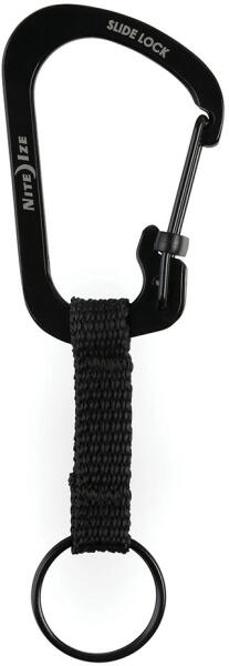 Zárható, rozsdamentes acél karabiner rövid szövetpánton lévő kulcstartó karikával. A karabiner egy SlideLock tolózárral reteszelhető, így magabiztosan rögzíthető egy övhurokhoz, hátizsákhoz vagy táska pántjához. Fekete színű változat.