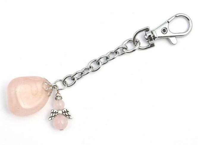 A rózsakvarc az egyik legnépszerűbb ásvány a hegyikristály mellett. 2-3 cm-es kavics formájú rózsakvarcból készült a kulcstartó, amelynek teljes hossza 8-9 cm. A karabiner és a többi felhasznált fém alkatrész antiallergén. Az angyalka 6 és 8 mm-es rózsakvarcból készül. A küldött kulcstartóban a rózsakvarc színe, formája, nagysága eltérhet a képen láthatótól.