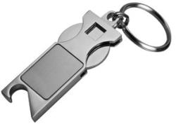 Fém kulcstartó, praktikus bevásárlókocsi érmével és sörnyitóval. Emblémázását lézergravírozással javasoljuk.