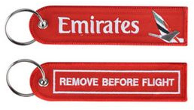 Emirates Remove Before Flight kulcstartó. 13 x 3 cm-es, fém kulcskarikával