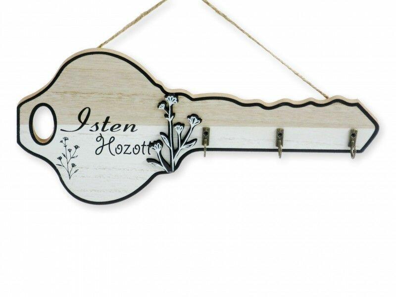 Fali kulcstartó 30x14cm 04792 Fa felakasztható kulcs formájú kulcstartó tábla, Isten hozott felirattal, fehér/natúr színű, virág dekorációval, 3 db akasztóval. Befoglaló méretek 30x3x14 cmAnyaga fa, fém