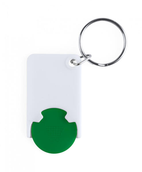 Műanyag bevásárlókocsi érme, fém kulcskarikával.