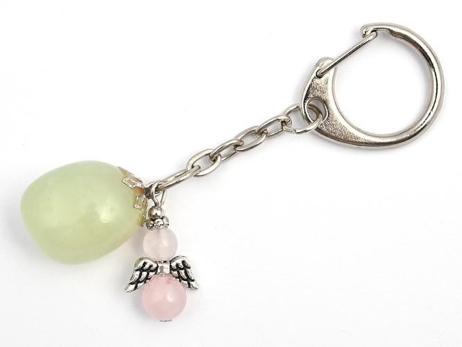 Szabálytalan formájú jádéból készült kulcstartó. A felülete jó csiszolt, de ennek ellenére tartalmazhat csiszolási hibát. A felhasznált jáde mérete 2-3 cm. A kulcstartó teljes hossza : 8-9 cm. A küldött termék alakja el fog térni a képen látottól. A rózsakvarc angyalka 6 és 8 mm-es rózsakvarc ásvány gömbökből készült antiallergén fém alkatrészekkel.
