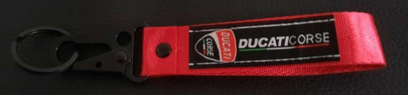 DUCATI motoros kulcstartó karabineres hímzett pánttal PRÉMIUM DUCATI motoros kulcstartó karabineres hímzett pánttal PRÉMIUM Erős szövet anyagú kulcstartó DUCATI mintával. A minta nem vasalt, hanem bele van hímezve. A kulcstartó tökéletes ajándék minden motorosnak. Nem nehéz így menet közben sem zavaró ha fent van a kulcsok mellett. Minta van mindkét oldalán , a kulcstartó