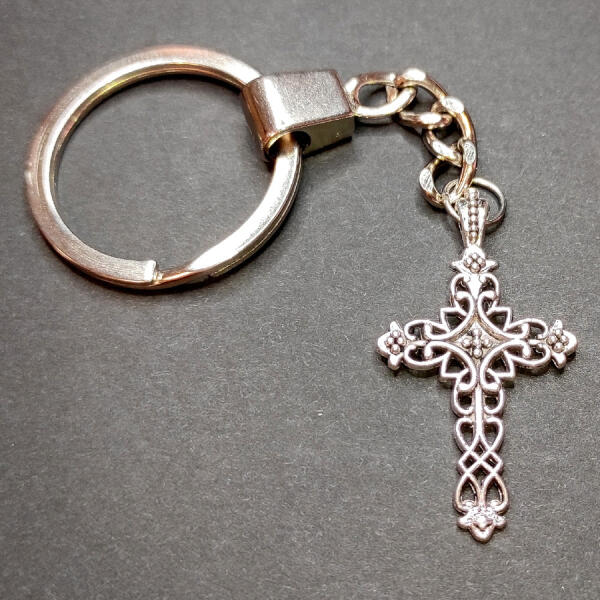 Antik hatású díszes kereszt kulcstartó. Paraméterek: Medál mérete: kb. 3,8 cm, anyaga fémötvözet. Kulcstartó karika típus eltérhet a képen láthatótól, készlet szerint küldjük. Ékszeralapok anyaga: rozsdamentes acél.