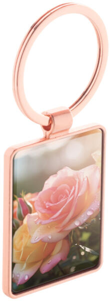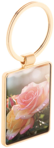 Téglalap alakú fém kulcstartó arany kivitelben, fegyverfém lemezzel. Kraft papír dobozban.