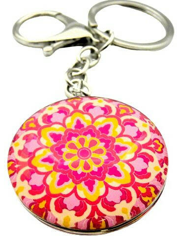 Mandalás kulcstartó rózsaszín-sárga színben, egyedi külsővel, amit táskadísz ként is használhat. Kedves ajándék lányoknak, nőknek egyaránt. Anyaga: Üveglencse - Mindkét oldalán azonos mintával Fém lánc, karika + karabíner Mérete: Átmérő 4 cm Vastagság 1.5 cm Kulcstartó: + 6 cm