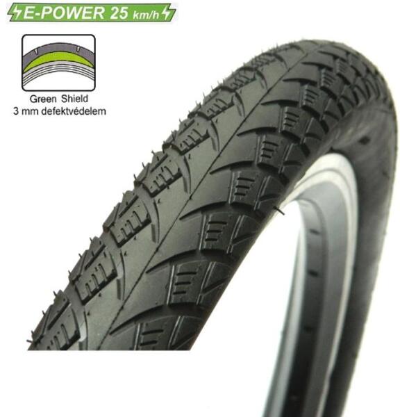 Modern forgásirányos városi kerékpár gumi, Green Shield 3 mm defektvédelemmel, Fényvisszaverő csíkkal Elektromos kerékpár kompatibilitás. ETRTO: 47-622 Súly: 990 g