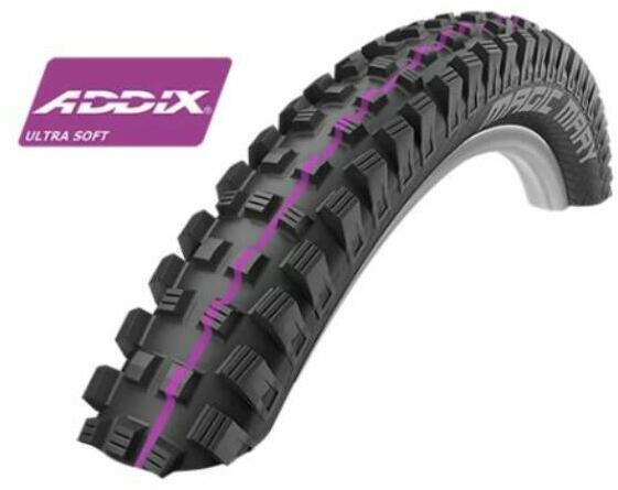 Schwalbe Magic Mary HS447 27,5x2,6 (65-584) külső gumi, kevlárperemes, Addix Ultra Soft, Super Downhill, SnakeSkin, TL-Ready, E50, 1420g A tökéletes gravity külső gumi. Vitathatatlan kedvence a Schwalbe Enduro atlétáinak. Tökéletes jellemzők szinte minden pályára és körülményre. A kifinomult középső minta a legjobb összetevőkből és technológiával készült, mely nem vár
