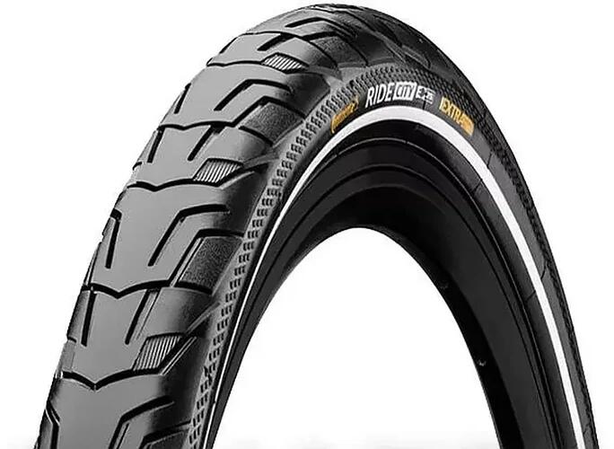 Continental Ride City 28 x 1,40 (37-622-700x35C) külső gumi (köpeny), drótperemes, defektvédett (Extra Puncture Belt), reflexcsíkos, E25, 850gRobosztus, modern megjelenésű gumiabroncs a csúcsforgalomra letisztult formájú gumiabroncs kifejezetten városi kerékpárokra, jól teljesít aszfalton és murvás utakon is nagy felületen érintkezik a talajjal, így biztosan tart megbízható,