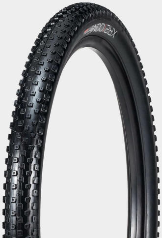 Bontrager XR2 Comp 29x2,2 (56-622) MTB külső, drótperemes, 705g. A Bontrager kedvező árú általános MTB külsője kis tömeggel és a drágább gumikkal megegyező mintázattal. Általános terephasználatra tervezett mintázat: középen kisebb bütykök a kis gördülési ellenállásért, oldalt nagyobb, sokszögű, többféle formájú bütykök a jobb kanyartartásért. 60 TPI-s szöve